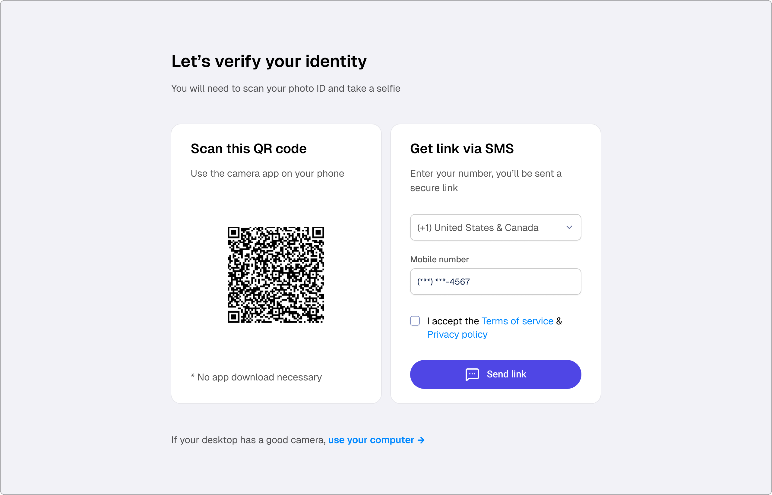 The JS Plugin has the ability to recognize a person's device (mobile, OS) and show the QR Code or SMS options if the person is on a desktop. It prompts the user to either scan a QR Code or input a mobile number to send an SMS message to. Verification continues on the person's mobile device. Once completed, control is given back to the desktop application. This allows for desktop onboarding while leveraging the user's superior mobile camera.